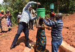 MKUU WA MKOA WA KIGOMA MHE. THOBIAS ANDENGENYE(KUSHOTO) AKIMTWISHA NDOO YA MAJI MKAZI WA KIJIJI CHA BIHARU (JINA HALIKUPATIKANA) MARA BAADA YA KUTEMBELEA KISIMA KILICHOFANYIWA MABORESHO K...