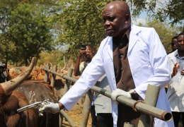 Mkuu wa Mkoa wa Kigoma IGP(Rtd) Simon Sirro akizindua rasmi zaoezi la Chanjo kwa ajili ya wanyama pamoja na utambuzi wa mifugo kimkoa wilayani Uvinza.